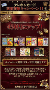 これらの人気作品デザインの50度数テレホンカードは、1枚450円で買取対応が行われます。ただし、保存状態(折れや汚れの有無など)により査定内容が変動する場合があるため、注意が必要です。